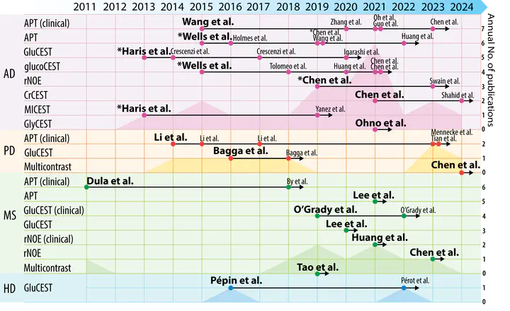 CEST studies for NDDs in past 15 yrsChemical exchange saturation transfer magnetic resonance imaging is an advanced imaging technique that enables the detection of compounds at low concentrations with high sensitivity and spatial resolution and has been extensively studied for diagnosing malignancy and stroke. In recent years, the emerging exploration of chemical exchange saturation transfer magnetic resonance imaging for detecting pathological changes in neurodegenerative diseases has opened up new possibilities for early detection and repetitive scans without ionizing radiation. This review serves as an overview of chemical exchange saturation transfer magnetic resonance imaging with detailed information on contrast mechanisms and processing methods and summarizes recent developments in both clinical and preclinical studies of chemical exchange saturation transfer magnetic resonance imaging for Alzheimer’s disease, Parkinson’s disease, multiple sclerosis, and Huntington’s disease. A comprehensive literature search was conducted using databases such as PubMed and Google Scholar, focusing on peer-reviewed articles from the past 15 years relevant to clinical and preclinical applications. The findings suggest that chemical exchange saturation transfer magnetic resonance imaging has the potential to detect molecular changes and altered metabolism, which may aid in early diagnosis and assessment of the severity of neurodegenerative diseases. Although promising results have been observed in selected clinical and preclinical trials, further validations are needed to evaluate their clinical value. When combined with other imaging modalities and advanced analytical methods, chemical exchange saturation transfer magnetic resonance imaging shows potential as an in vivo biomarker, enhancing the understanding of neuropathological mechanisms in neurodegenerative diseases.